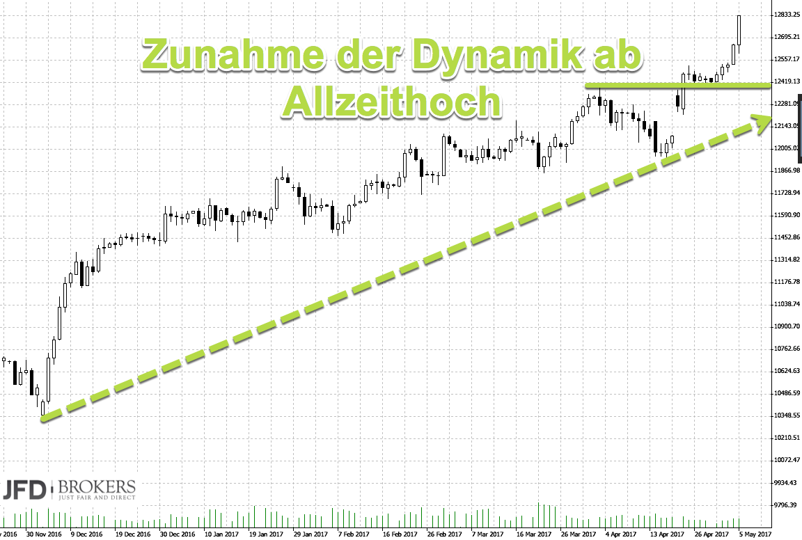 Zur Darstellung des Tagescharts nutze ich heute den Vollzeitchart, also auch außerhalb der XETRA-Handelszeiten. Dort ist die nachbörsliche Bewegung vom Freitag mit abgebildet. Klar zu sehen ist die Aufwärtstendenz und ebenfalls gut erkennbar die Dynamik ab Überschreitung der 12.400 Punkte.